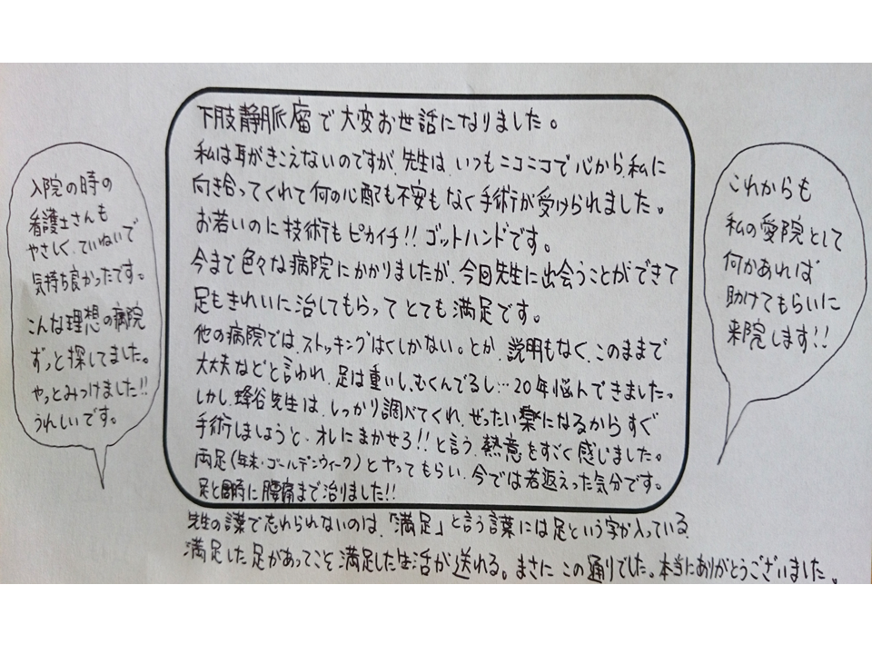 うれしいお言葉ありがとうございます。症状をとるのも治療ですが、膨れ上がった血管を取り除くというのもすごく大切なことです。女性の方ですとスカート、男性ですと半ズボンはきたくないという相談もよく受けます。美容面にも気を使って治療していきます。ありがとうございます。